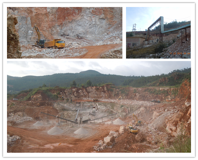 爆破后由挖掘機剝離礦石覆蓋物,利用裝載機將少量的廢石運輸至工業場地的平整和道路的修復,礦石一部分通過裝載機鏟運運至破碎機受礦口,大塊的礦石通過挖掘機進行破碎后通過裝載機鏟運至破碎機受礦口進行破碎。