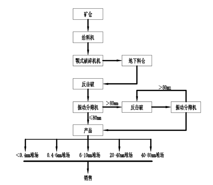 礦山現有破碎站采用兩級破碎、兩級篩分的閉路返回流程,機械化程度較高,可將礦石加工成不同需求的五級原料。破碎后的礦石原料對外進行銷售,礦石加工工藝系統流程圖如下: