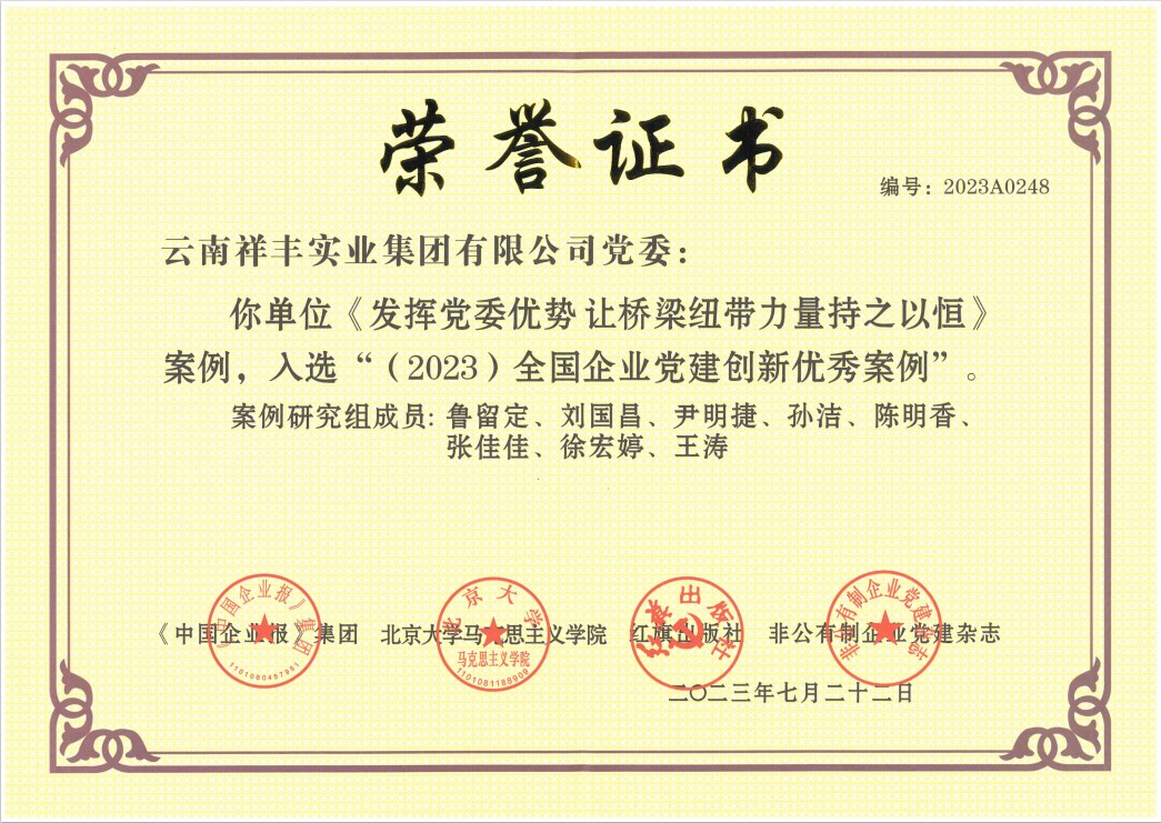 2013年7月,祥豐黨支部2011—2012年度"云嶺先鋒"工程被中共連然街道工作委員會評為"先進基層黨組織";2013年7月,祥豐黨支部被中共安寧市委評為"基層黨建示范點";2013年7月,公司團工會楊洪銘被推薦為"安寧市青年聯合會第二屆委員會委員";2013年7月,公司團工委組織公司全體職工團員青年開展"愛心水窖"捐款活動,祥豐集團